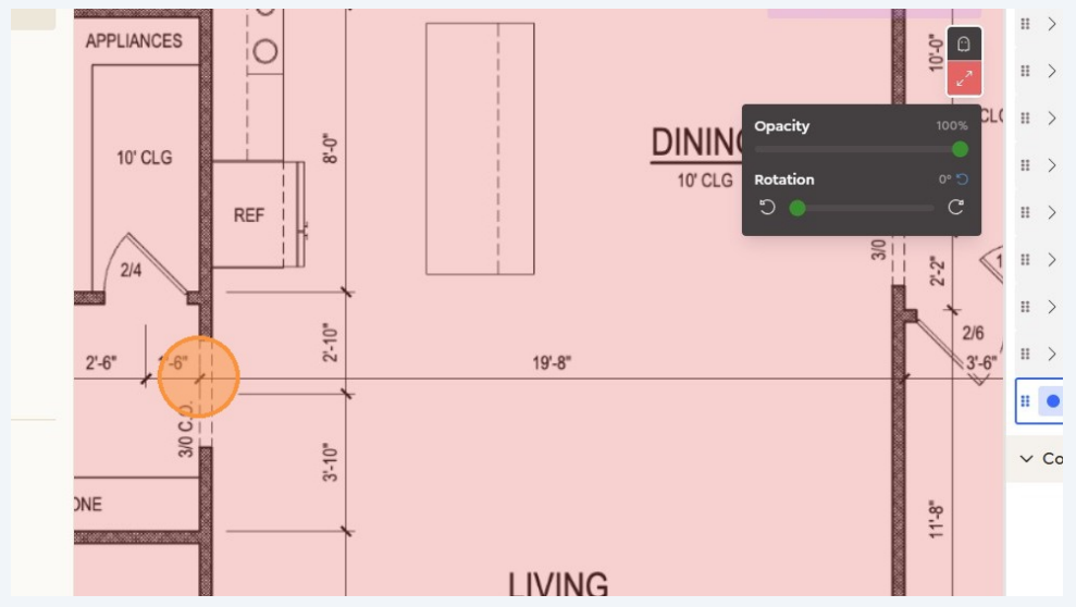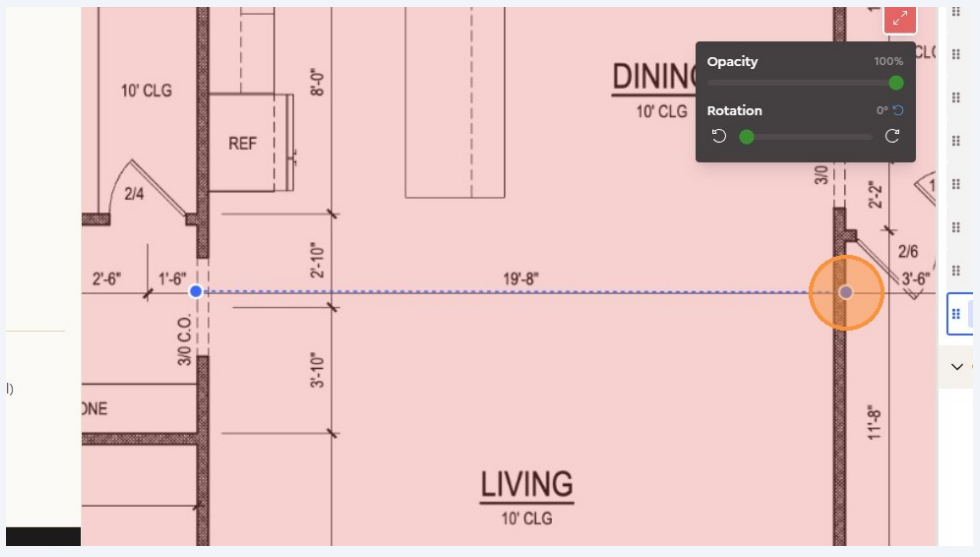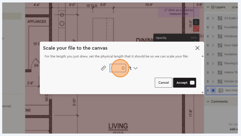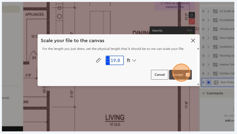 Enter the real-world measurement. Example: If a wall is labeled 19 ft 8 in, click the two endpoints of that wall and type 19.8 in the scale input box
