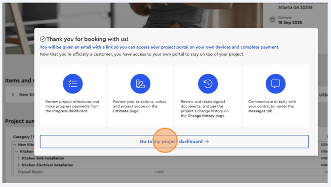 Once the proposal is signed, the client is taken to their Client Project Dashboard, where they can continuously stay up to date with the project’s progress.