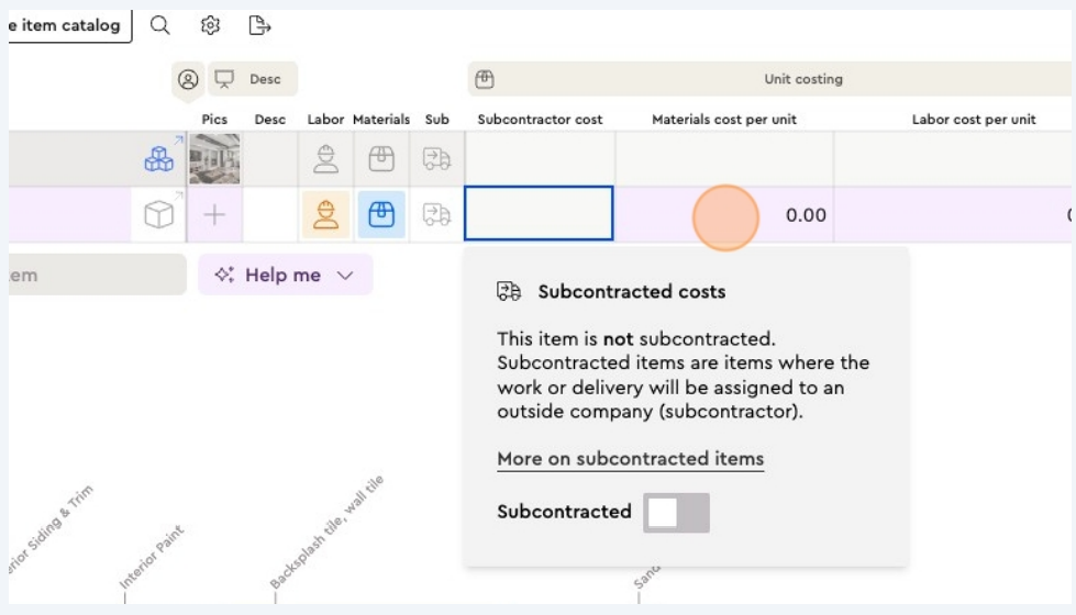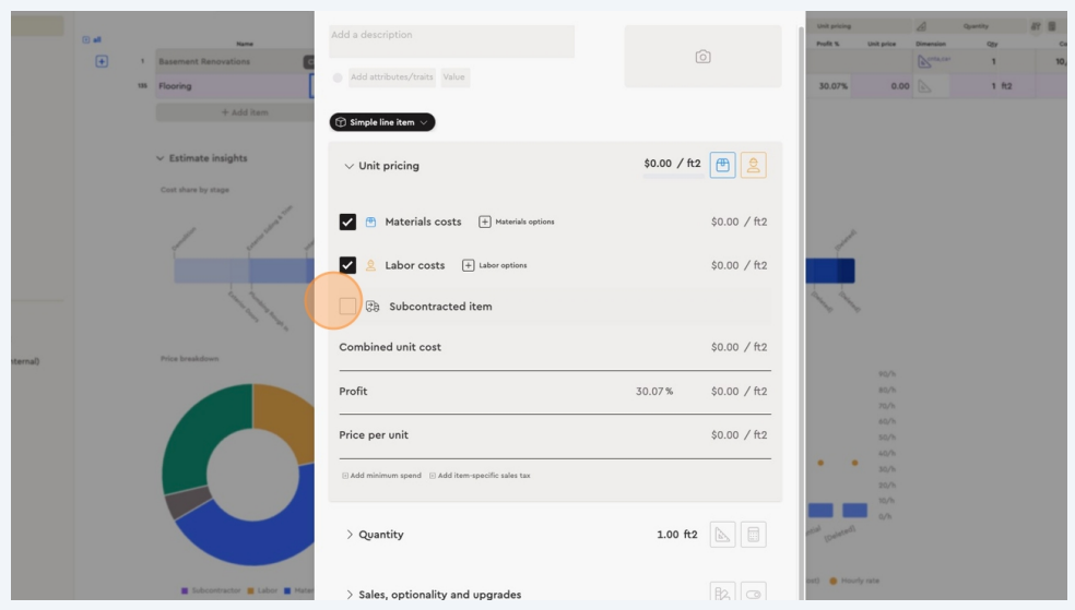 add labour cost per unit, material cost per unit, subcontractor cost, or a combined unit cost (premarket price). The system will then show the client the post-markup price.