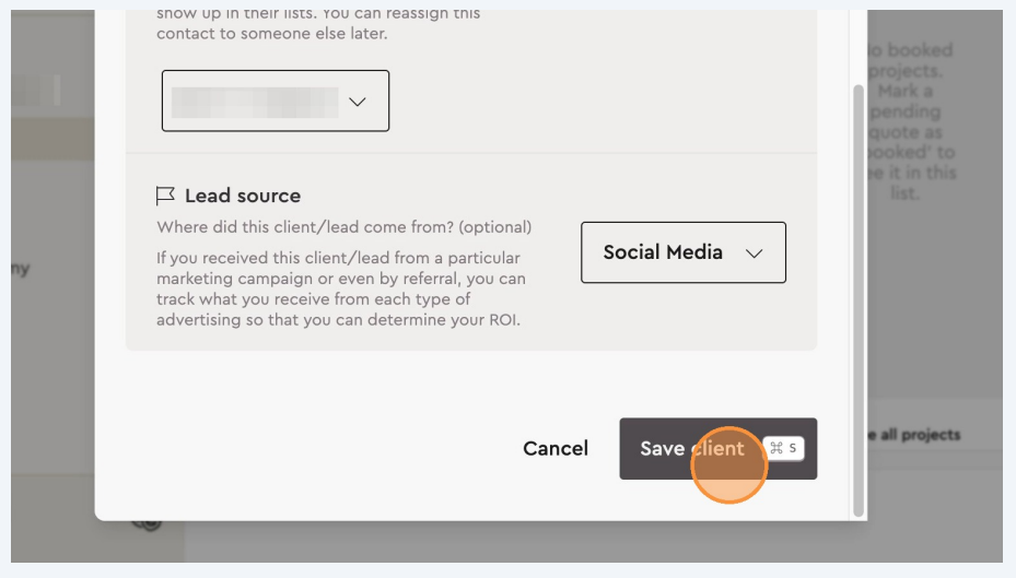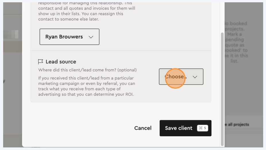 Before saving a new client, you may also specify the lead source by selecting the appropriate option from the lead source menu. (optional)