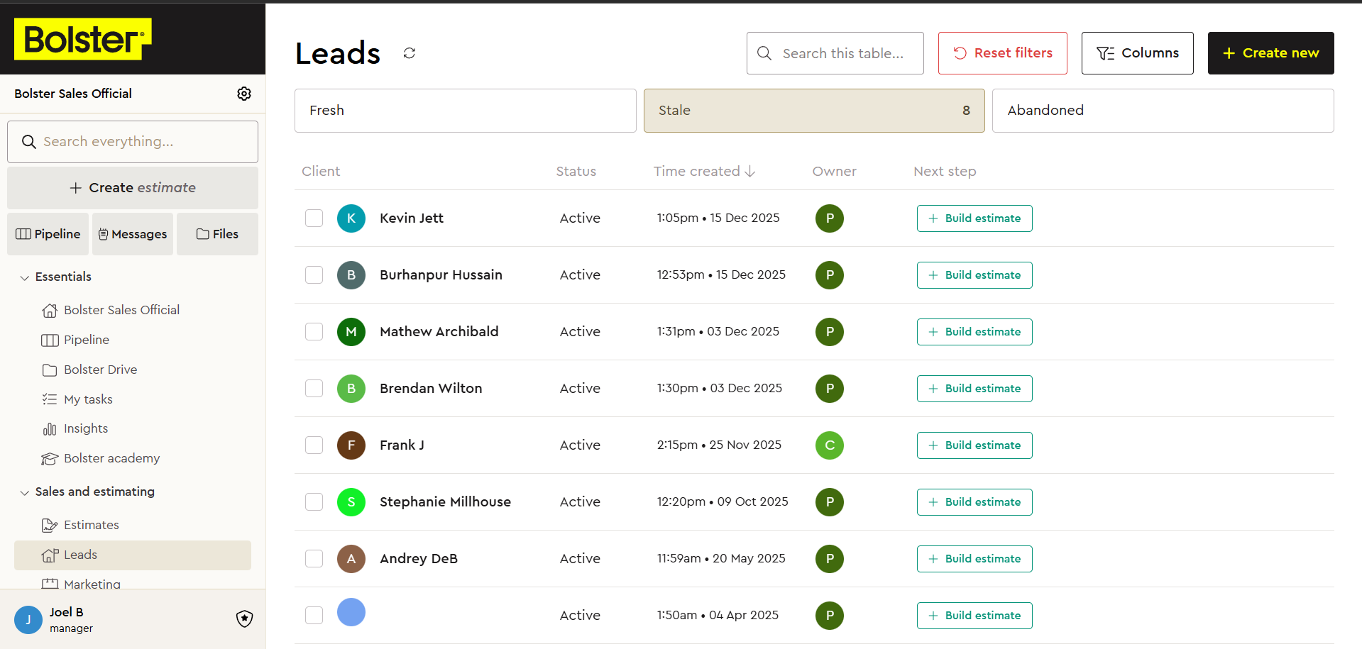 Bolster’s Lead Management feature helps you capture, organize, and convert leads into estimates and projects — all from one centralized pipeline. Every job in Bolster starts with a lead, making this feature the foundation of your sales workflow.