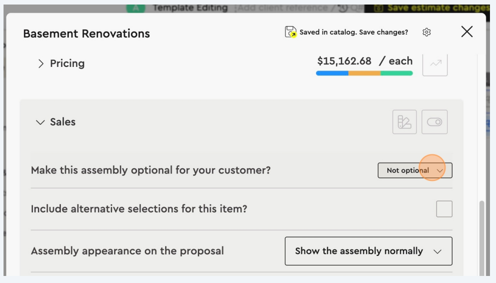 Scroll down in the assembly settings panel until you see the Make this Assembly Optional option. This will give the client the ability to choose if they want this group of items or work scopes in their project.