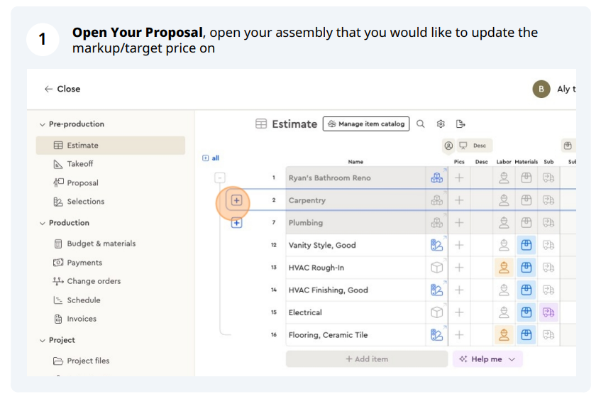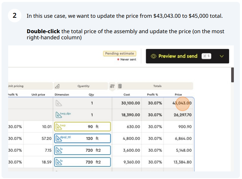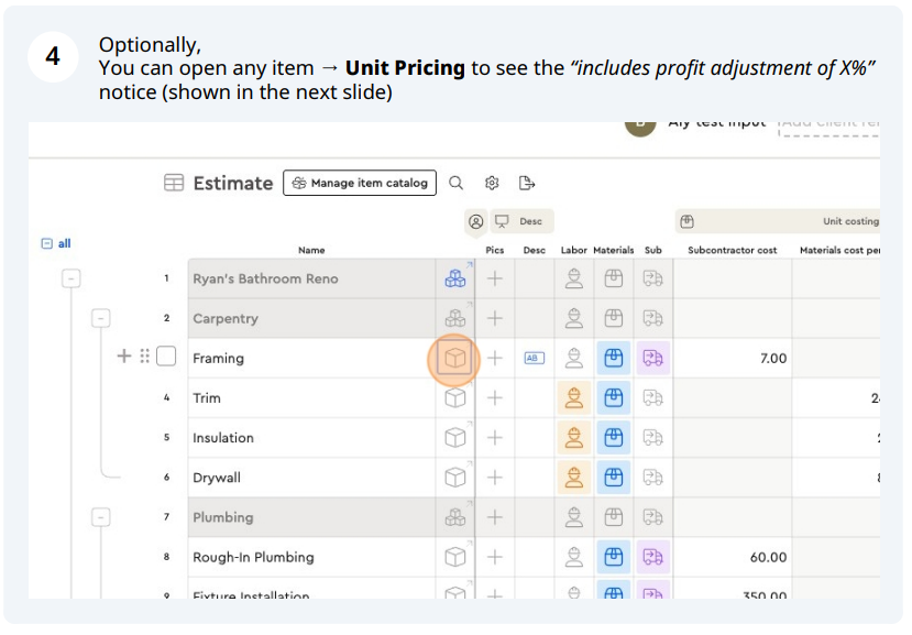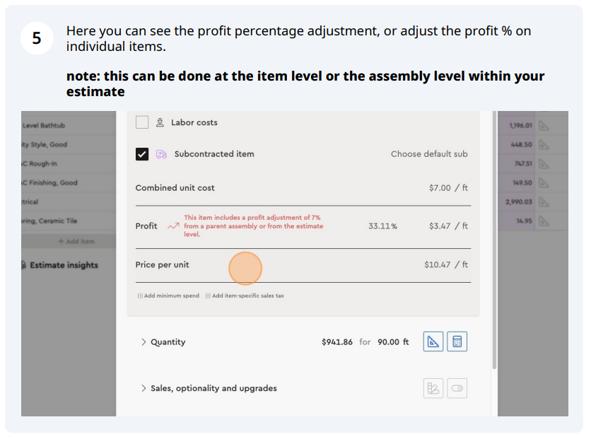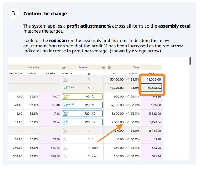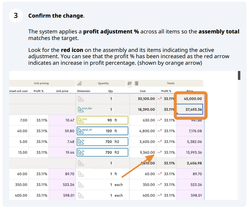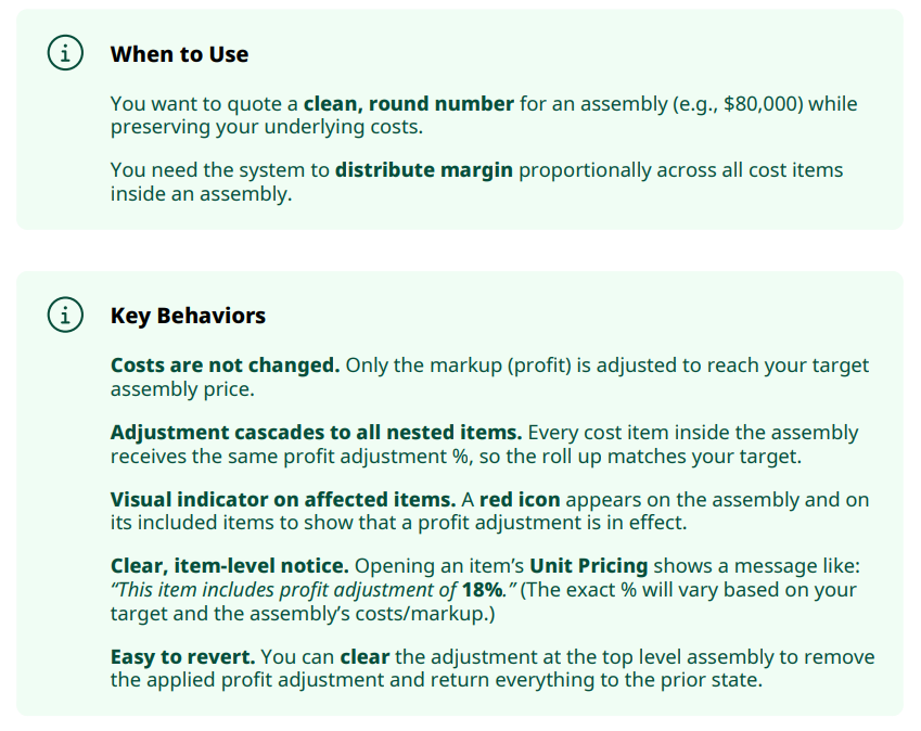 The system calculates a single profit adjustment % and applies it across all cost items inside the assembly so the assembly’s total price "bubbles up" to your target.