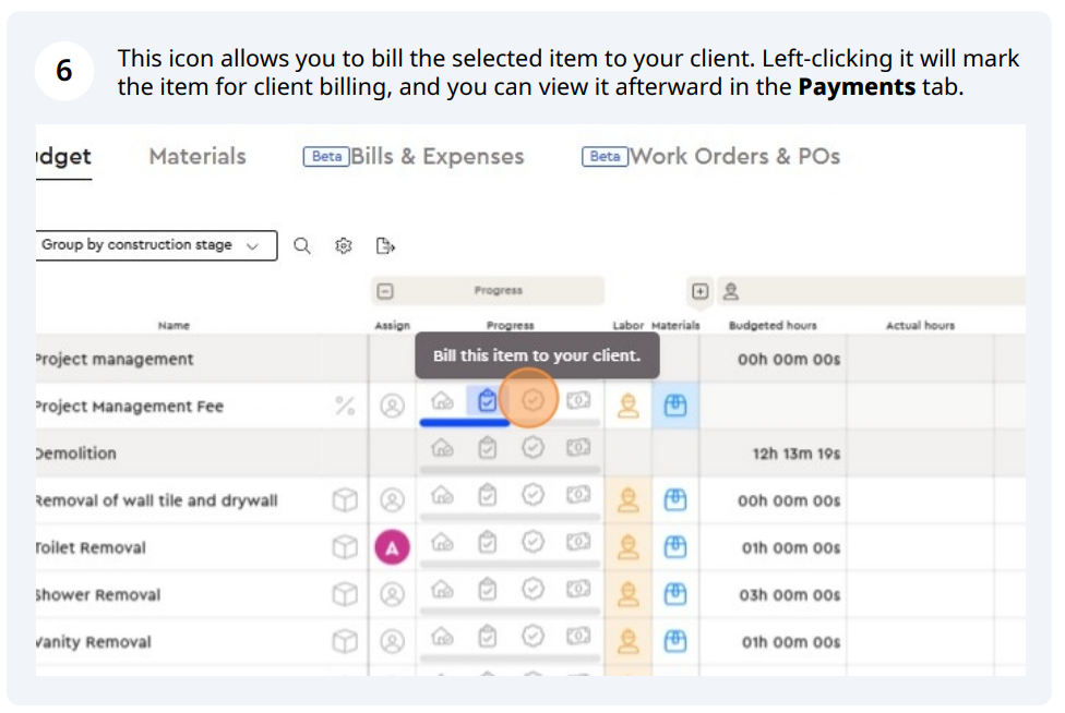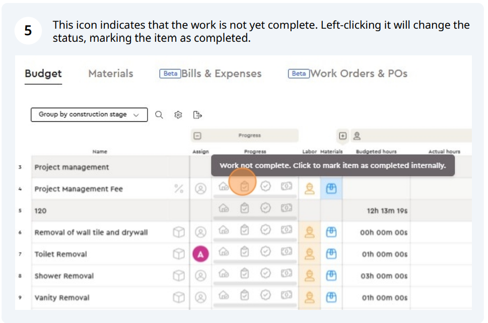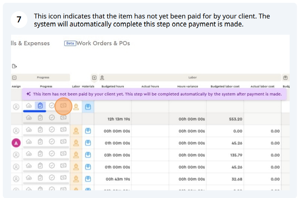 These visual indicators (colored icons) make it easy to understand the status of each line item at a glance, ensuring no step is missed in your billing and project tracking process.