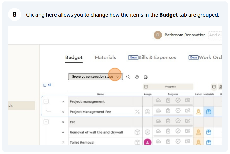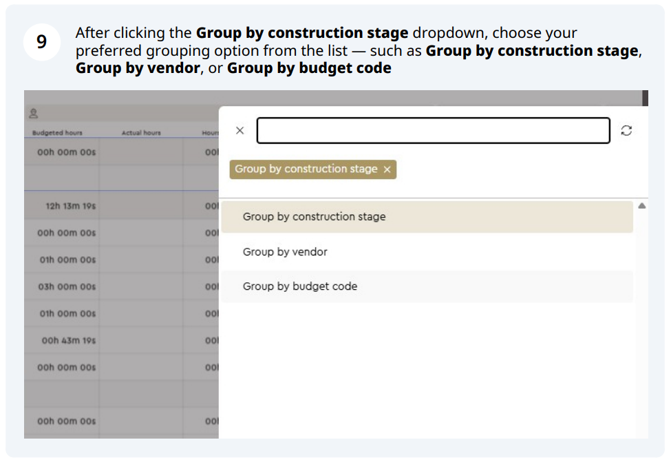 You can group your budget items by Construction Stage, Vendor, or Budget Code.
