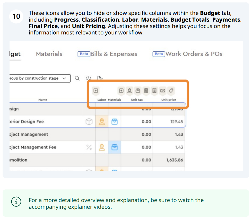 Each can be shown or hidden using the view customization toolbar, helping you tailor the Budget Tab layout to your preferences.