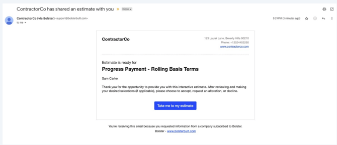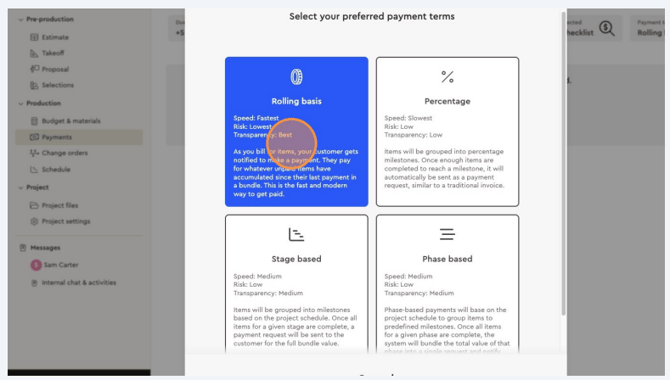 Bolster gives you several ways to manage how you get paid during a project. These options make sure you’re not waiting until the very end of a job to receive money, while also giving your clients clarity and flexibility.