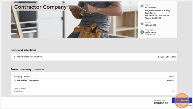Your client will receive a notification to view the proposal, in this they can see the level of detail you’ve shared, make selections, approve the proposal, and accept the project’s terms and conditions.