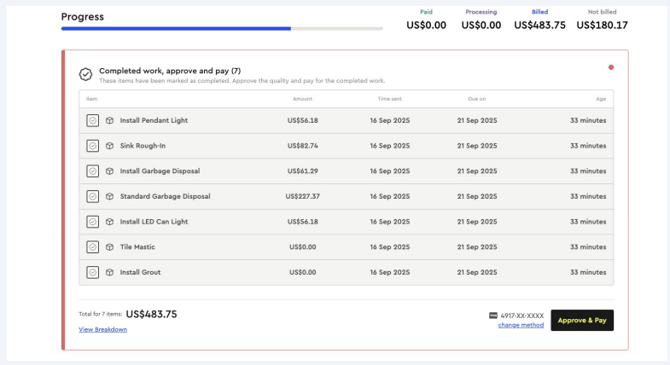 What it is: Items/ Tasks get marked as completed. A payment request is automatically sent to your clients for approval & payment.