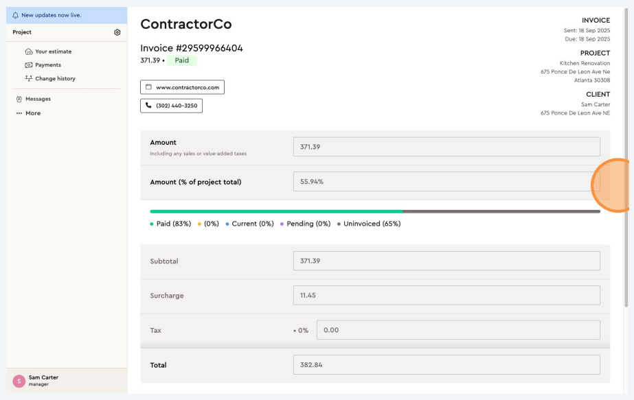 The client can open the invoice to see the payment details, along with the overall progress of payments made for the project.